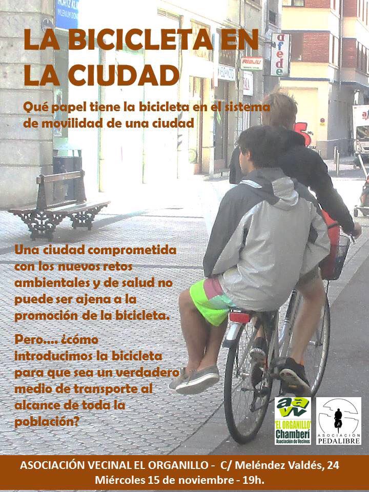 Bicicleta en la ciudad” a cargo de Pedalibre, en la sede de la asociación vecinal El Organillo. Miércoles 15 noviembre a las 19h.